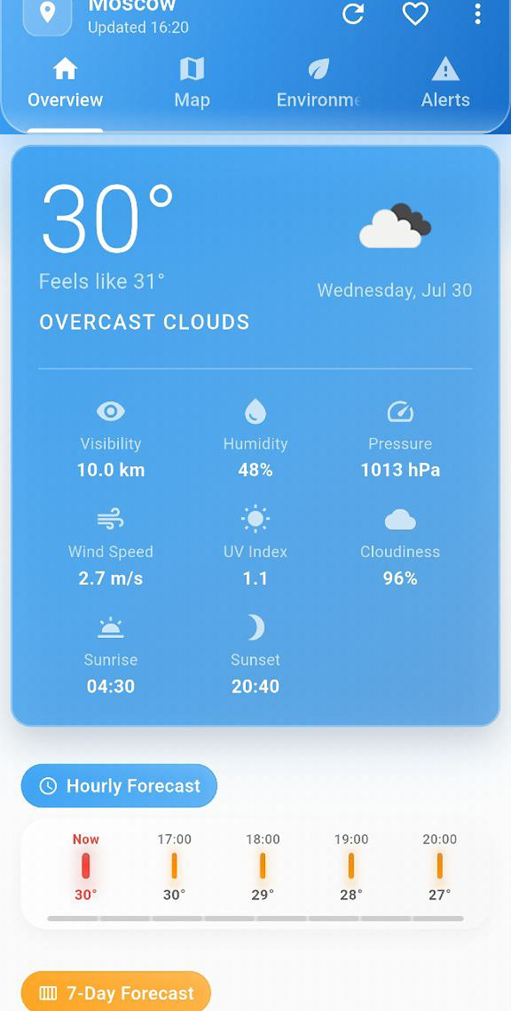 Get precise weather information for anywhere in the world with hourly updates and 7-day forecasts including temperature, humidity, wind speed, and precipitation probability.